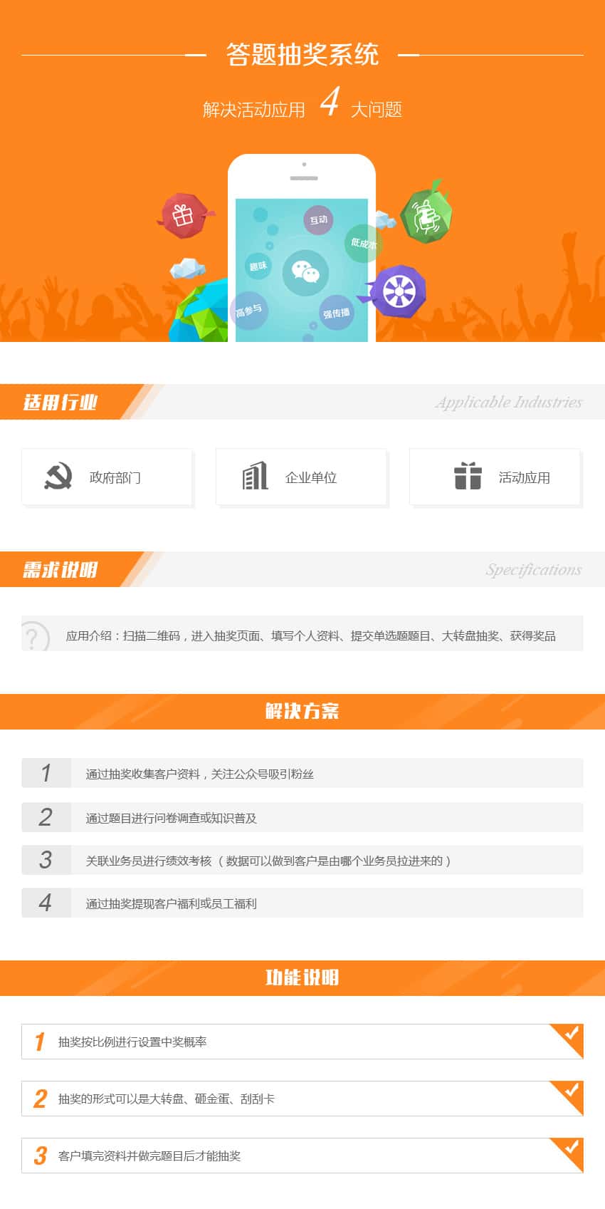 应用介绍:扫描二维码,进入抽奖页面、填写个人资料、提交单选题题目、大转盘抽奖、获得奖品。